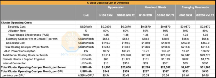 过去18个月内,H100服务器单价已有所下降,目前约为19万美元/台。对典型超大规模供应商而言,包含存储、网络及其他组件的单服务器前期资本支出总计达25万美元。