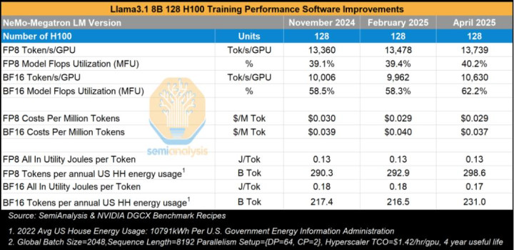 从BF16的模型浮点运算利用率(MFU)来看,在12个月内从34%显著提升至54%,训练吞吐量单凭CUDA软件栈的改进就实现了57%的提升。这一进步得益于NVIDIA CuDNN/CuBLAS工程师编写了更优化的融合wgmma内核,以及NCCL工程师开发出使用更少流多处理器(SM)完成通信的集体操作算法等多项优化。归根结底,软件全栈优化才是关键所在。