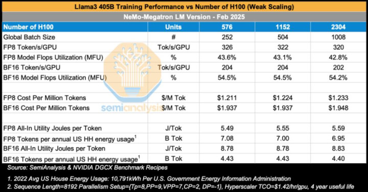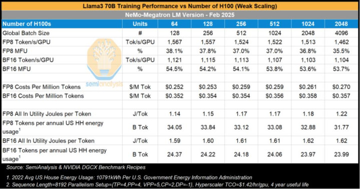就能耗而言,FP8精度下,在2,408块H100上训练每个token的能耗比64块H100集群高出10%。若以64块H100训练Llama3 70B至15万亿token(FP8精度),所需能耗相当于440个美国家庭的年用电量;而将规模扩大至2,048块H100时,这一数字将增至472个家庭年用电量。