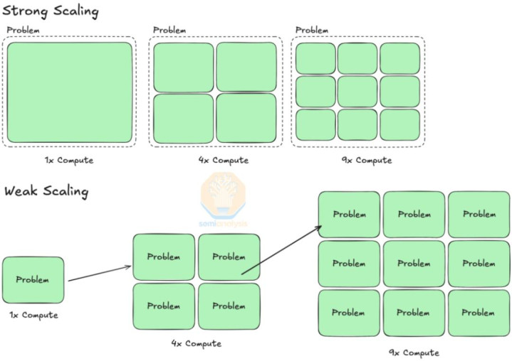 弱扩展(Weak Scaling)和强扩展(Strong Scaling)用于描述在不同问题设置(如不同批量大小)下扩展计算资源所带来的性能提升方式。